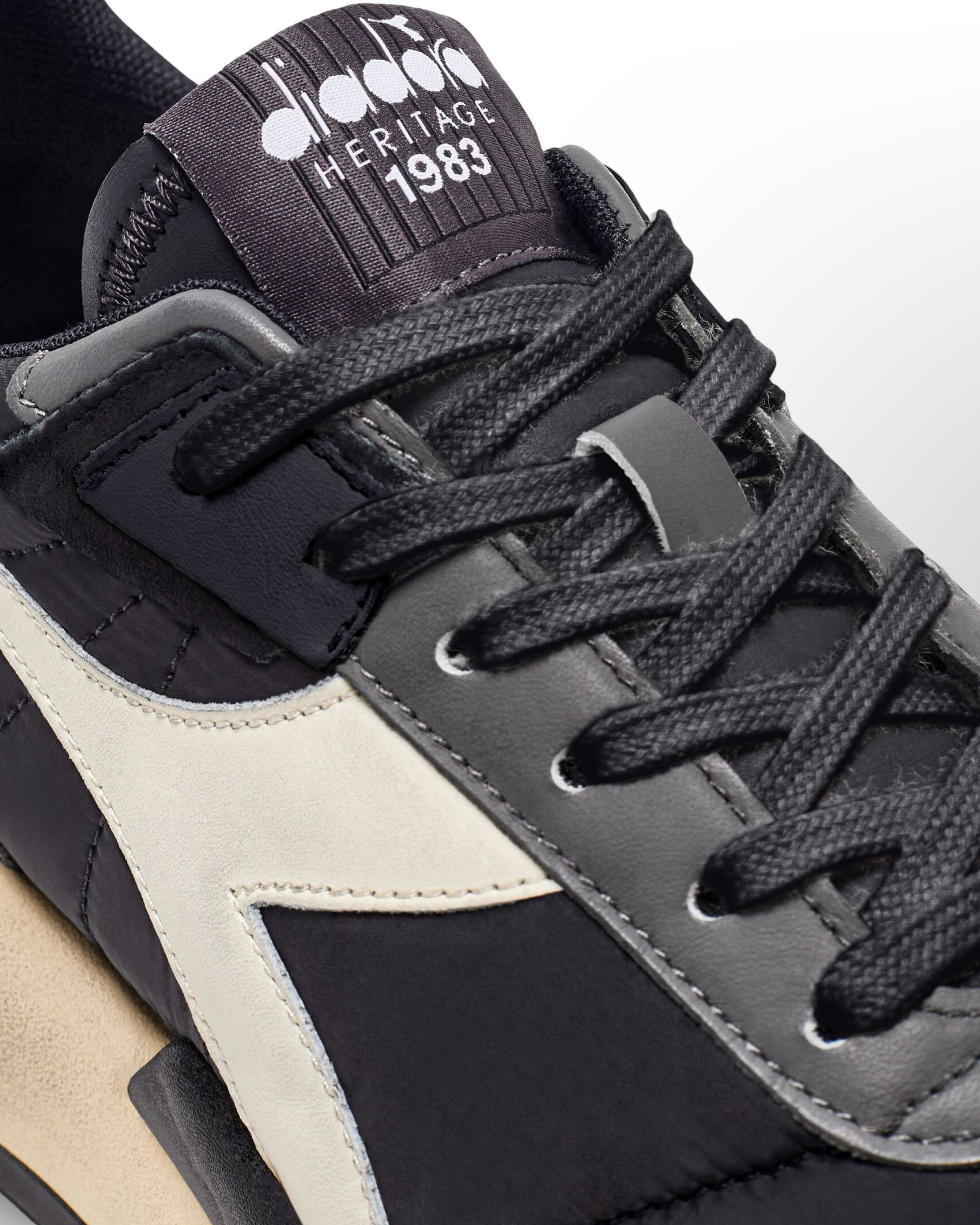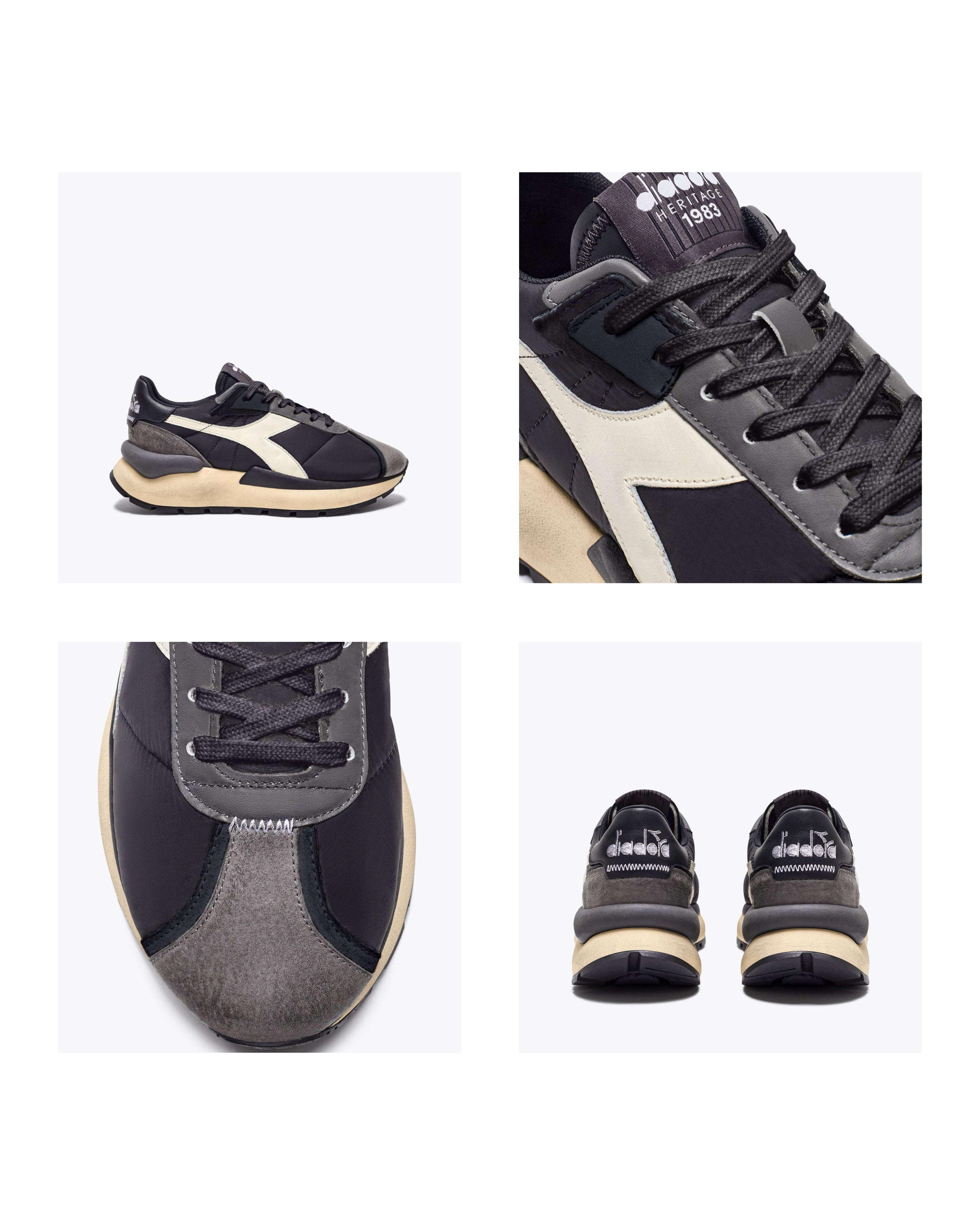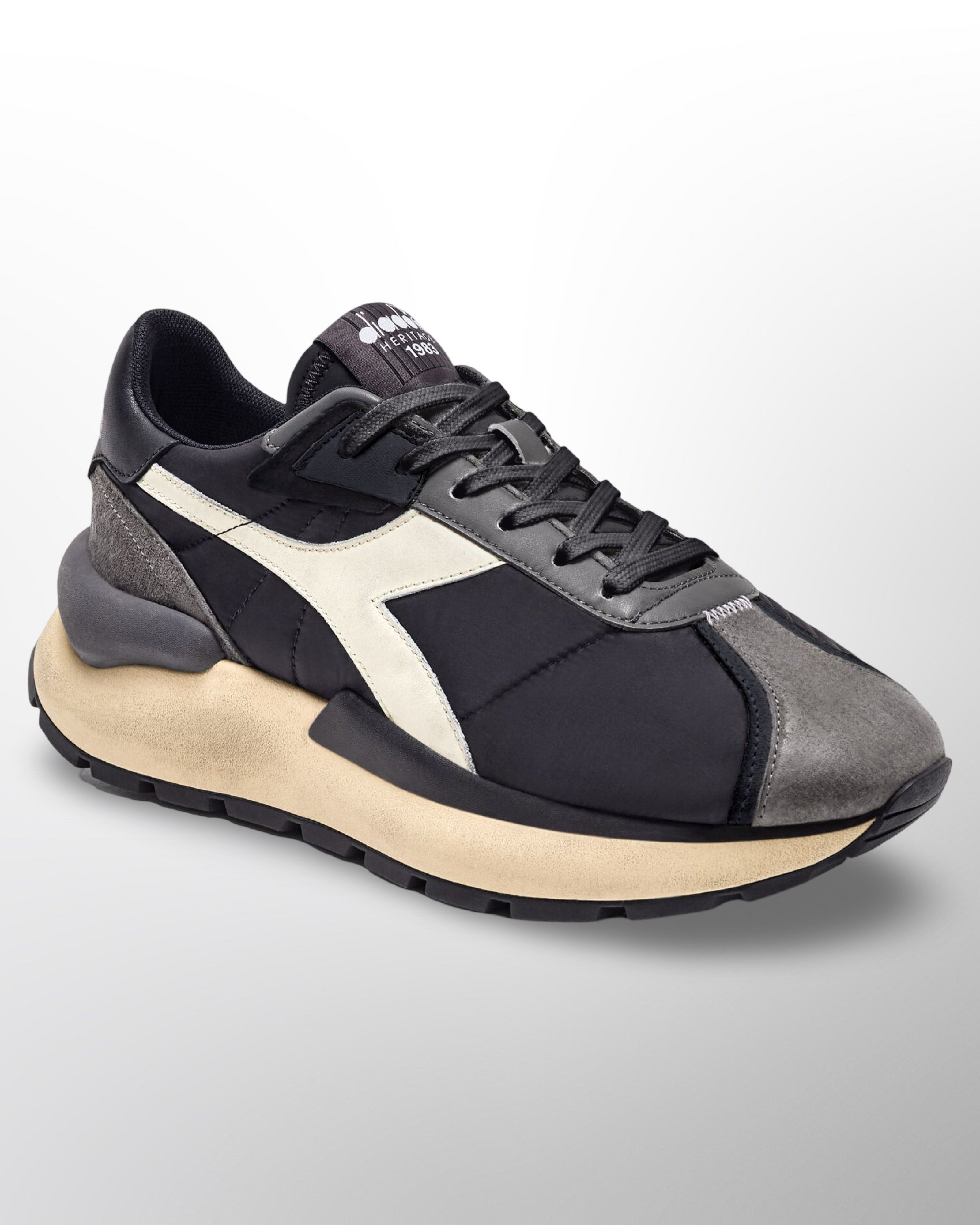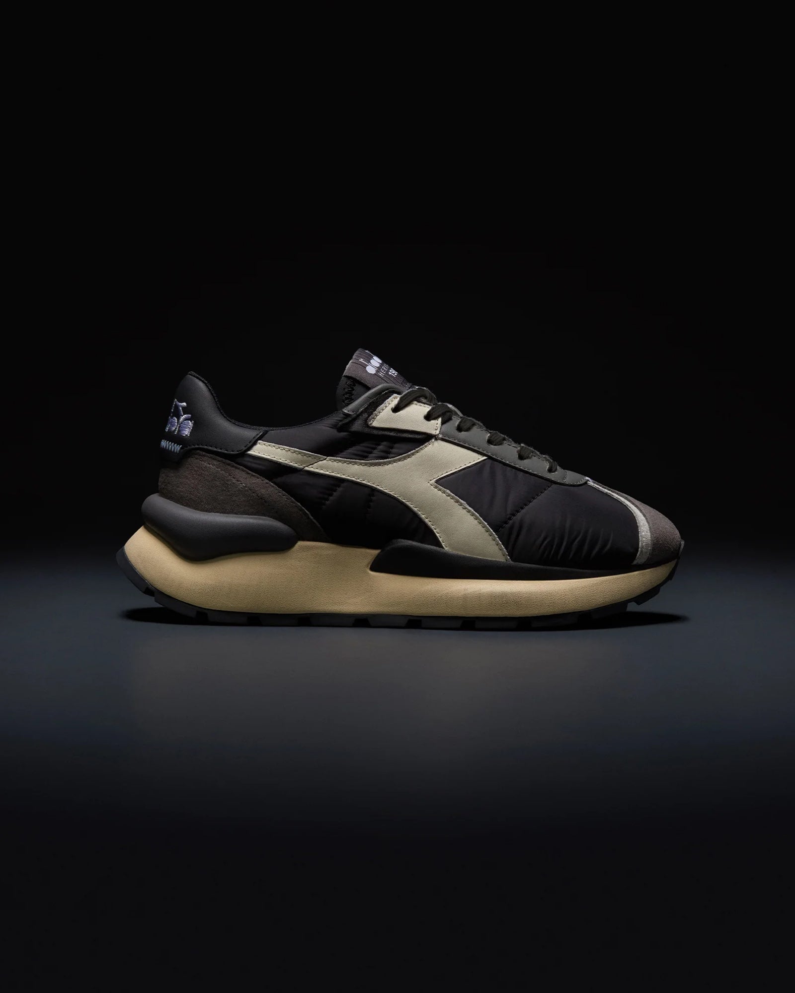 ディアドラの1983年製トラックシューズのオリジナルアッパーを使用し、現代的なデザインとして、オーバーサイズの安定ソールを組み合わせた。このデザインは、クラシックなシューズの上部に、モダンで存在感のあるソールを加えることで、よりコンテンポラリーな印象を与えるものになります。