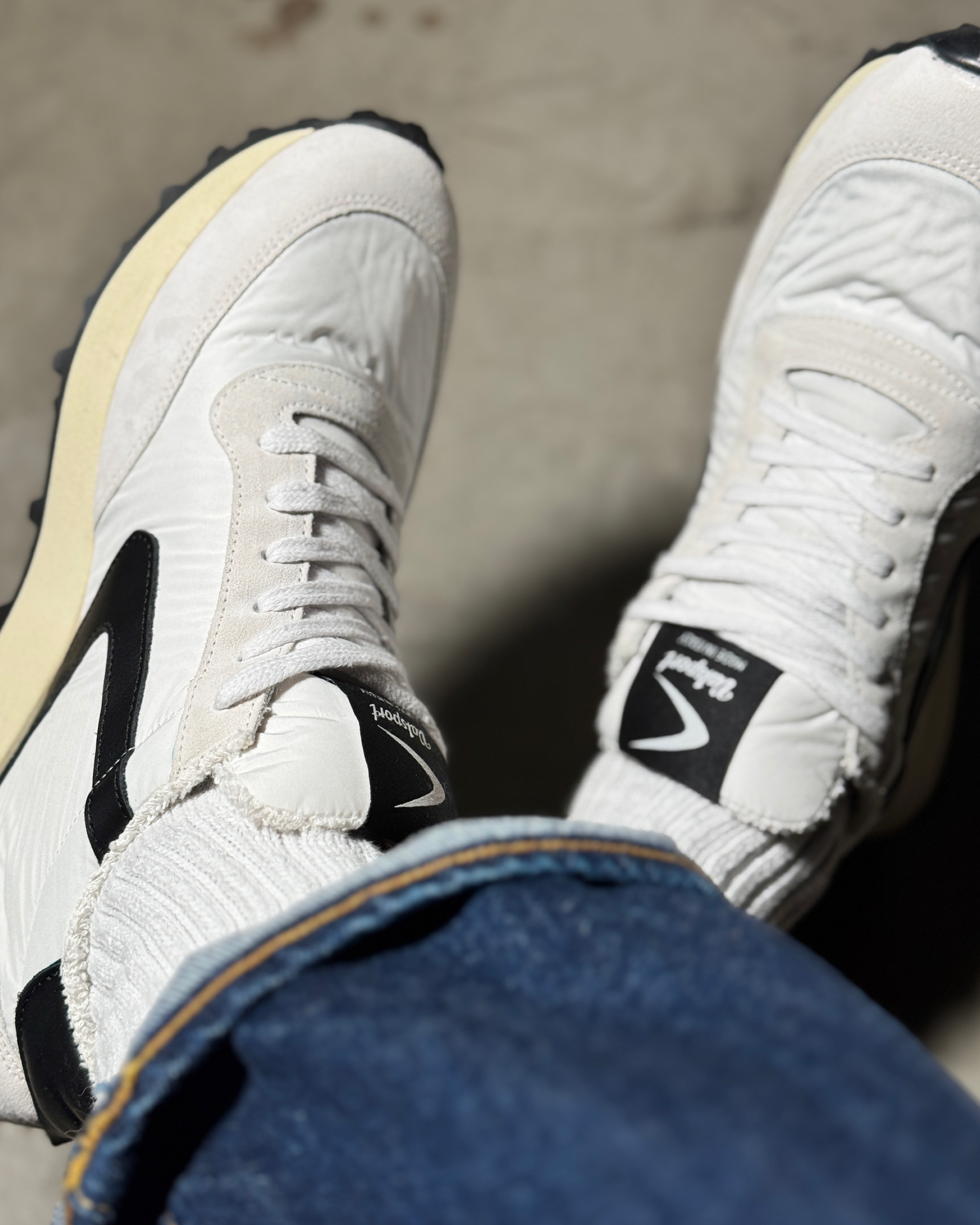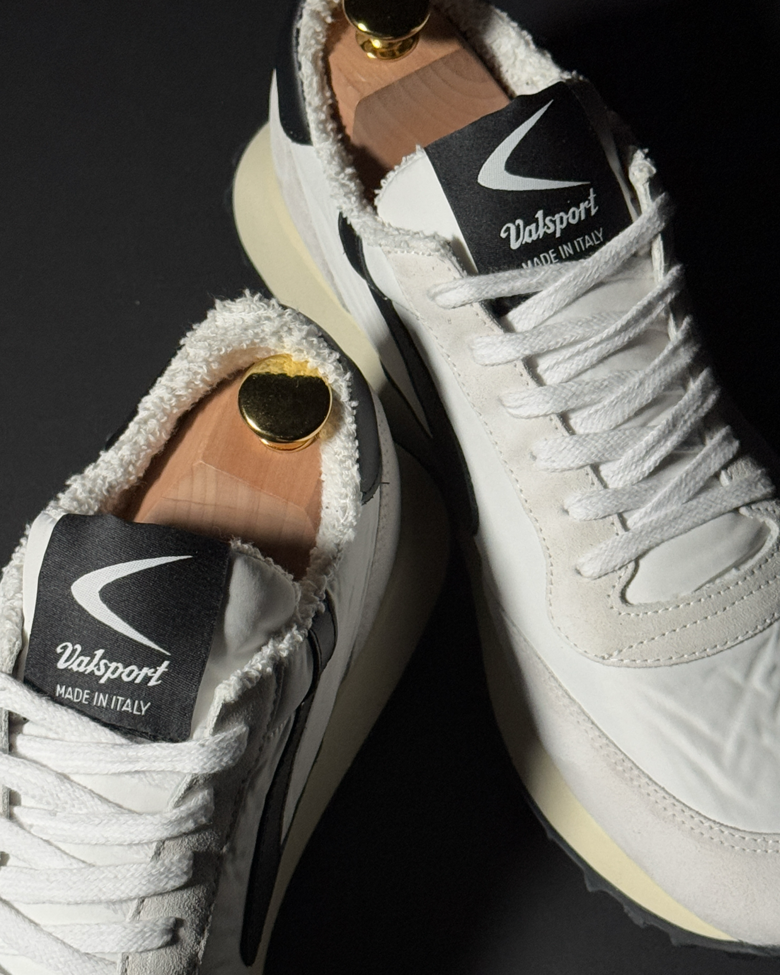 イタリア本国では、「START HERITAGE」は明るいカラー展開が中心ですが、このたびは東京の街並みに似合うよう、干場氏がホワイト×ブラックというシンプルな色使いをリクエスト。クラシカルなカラーリングで、オリジナルの「START HERITAGE」シリーズにはない魅力を搭載しています。ソールも、元々経年変化で褪せたような黄みがかった色合いが特徴ですが、本別注モデルでは、都会らしい一足を目指して、あえてクリーンなホワイトソールを厳選。Valsportの魅力であるレトロな雰囲気を損なわぬよう、干場氏が究極のバランスを追求いたしました。